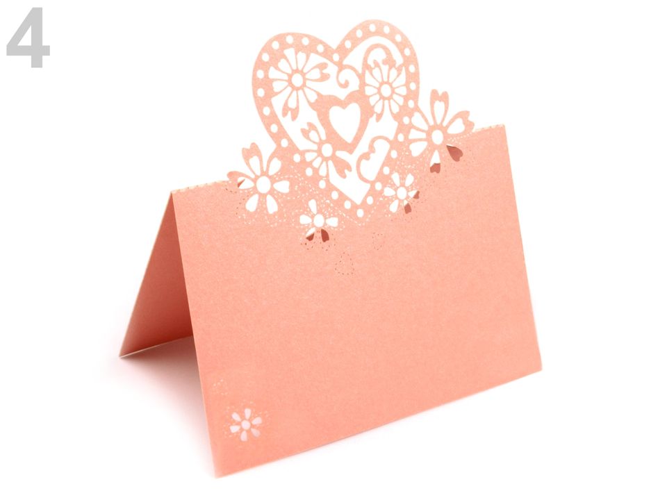 Menovka v tvare srdca, vhodná k rozloženiu na stôl. Je vyrobená s perleťového papiera.